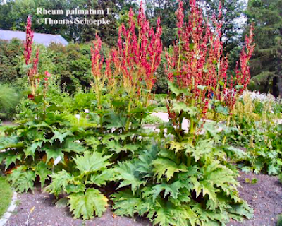 - Rheum palmatum - Turkey rhubarb, Chinese rhubarb, East Indian Rhubarb. Some sources say Rheum palmatum is a synonym for Rheum rhaponticum but this is not correct. The leaves of the Turkey Rhubarb are palmate and somewhat rough. The root is thick, of an oval shape, sending off long, tapering branches; externally it is brown, internally a deep yellow color. The stem is erect, round, hollow, jointed, branched towards the top, from 6 to 10 feet (2-3 m) high. This species is distinguished from our familiar garden Rhubarb by its much larger size, the shape of its leaves, with their oblong, sharpish segments, and the graceful looseness of its little panicles of greenish-white flowers. The first buds which appear in spring are yellow, not red. Perennial, typical height 2 m (6.5 ft), Leaf stem eaten raw or cooked. Superior in flavor to the common rhubarb and quite tender, has a long and proven history of herbal/medicinal usage Bold, dramatic dark purple foliage with 6 foot (2 m) long stems that bear rose-red pyramids of flowers in late spring. Several varieties of this are known: ‘Atrosanguineum’, ‘Bowles Crimson’, rubrum, tanguticum, and tanguticum ‘red selection’.