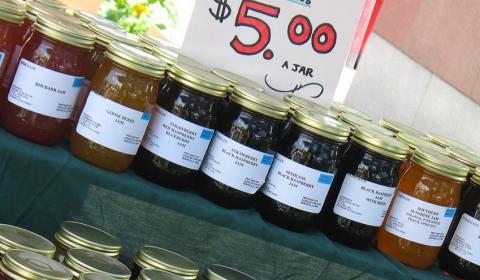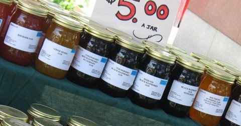 Jams—Apricot, blackberry, boysenberry, dewberry, loganberry, red raspberry, youngberry, blueberry, cherry, currant, fig, gooseberry, grape, orange marmalade, peach, pear, plum, rhubarb, strawberry, and spiced tomato.